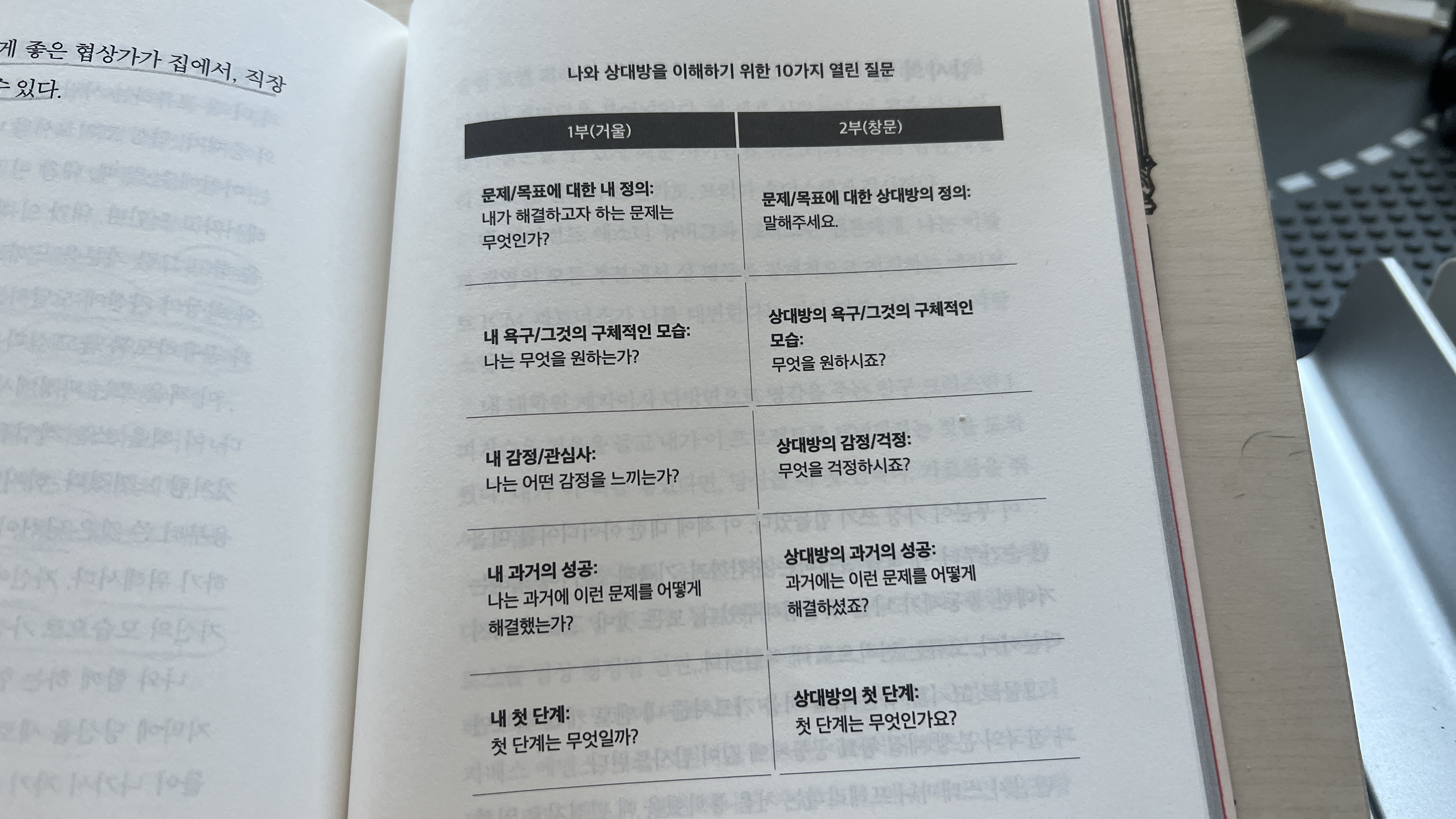 저자는 협상 이전에 갈등해결에 대해서 공부를 했다고 하는데, 책의 전반적인 내용은 김인수씨의 해결중심 단기코칭이라는 책의 내용과 많이 비슷한 점이 많습니다. 기적 질문이나, 성공 경험 등등... 해결중심 책은 초강력 추천할만한 책이니 참고해 보세요.