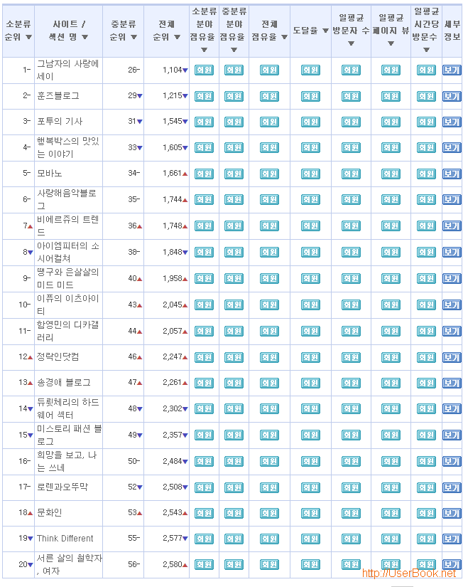 블로그의 경우 방문자수를 공개 해 놓으면 알 수 있지만, 전체적으로 정확한 방문자수나 페이지뷰를 집계하는 곳이 없어서 알기가 어려운데, 랭킹닷컴 개인 블로그 순위를 보면 등록한 사용자들 중에서 페이지뷰를 볼수가 있습니다.