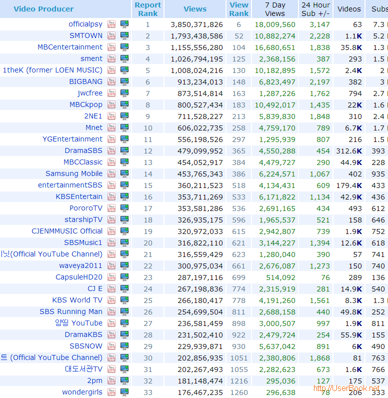 위의 유튜브 순위를 보면 재미있는것이 있는데, 맨 오른쪽의 비디오 숫자를 보시면 offcialpsy의 경우는 단 63개의 동영상으로 1위를 지키고 있고, SBS나 KBS등의 방송국은 몇십만개를 가지고 싸이의 순위에 미치지 못하고 있네요.
