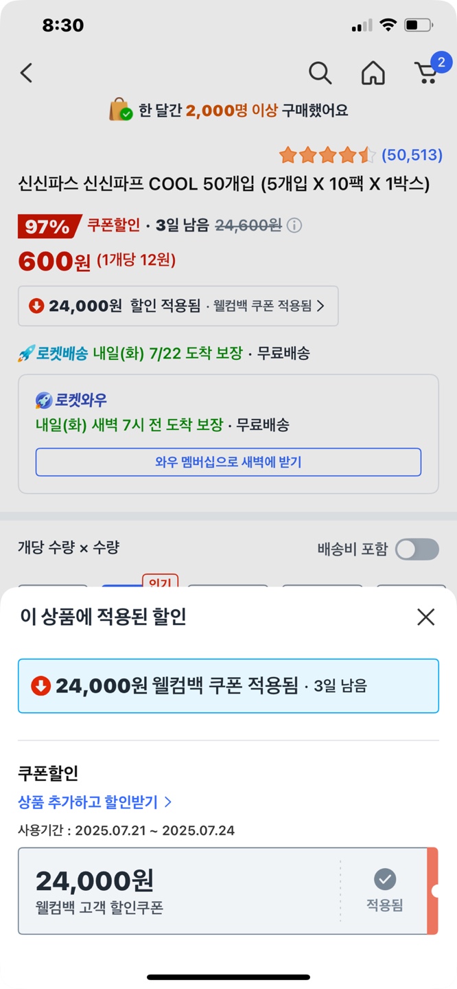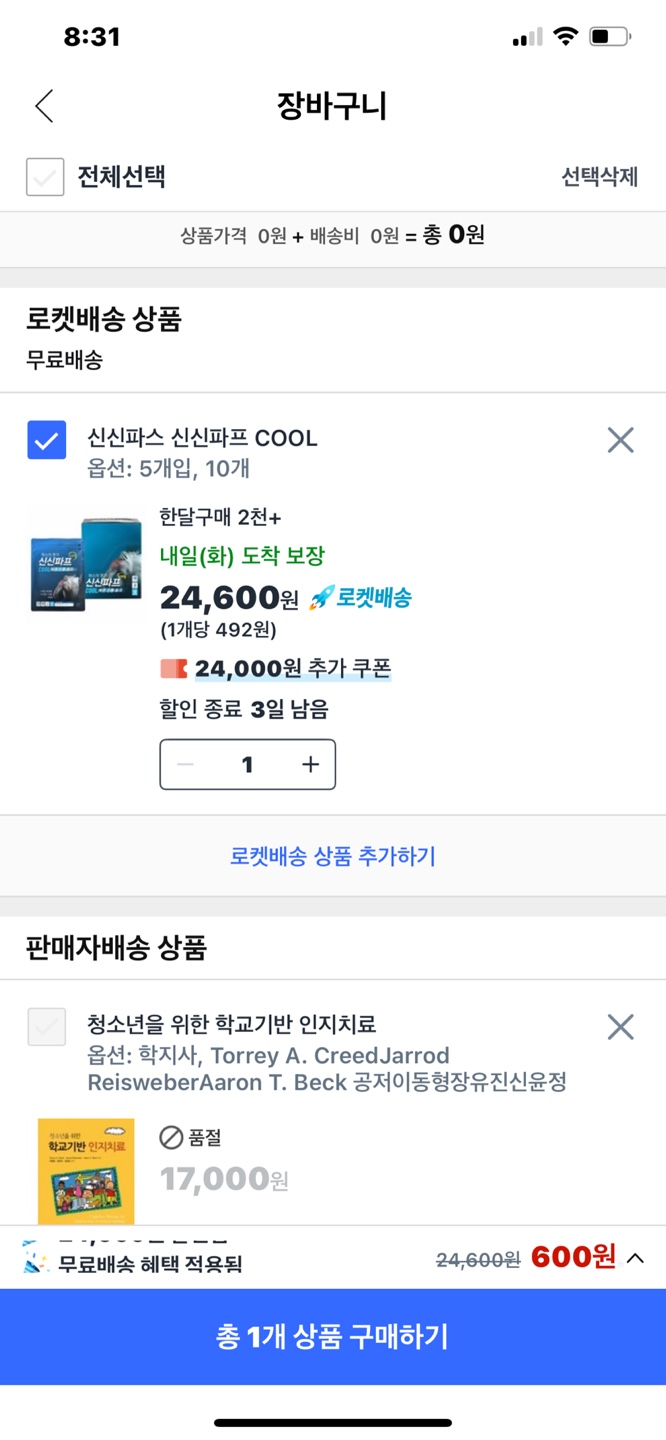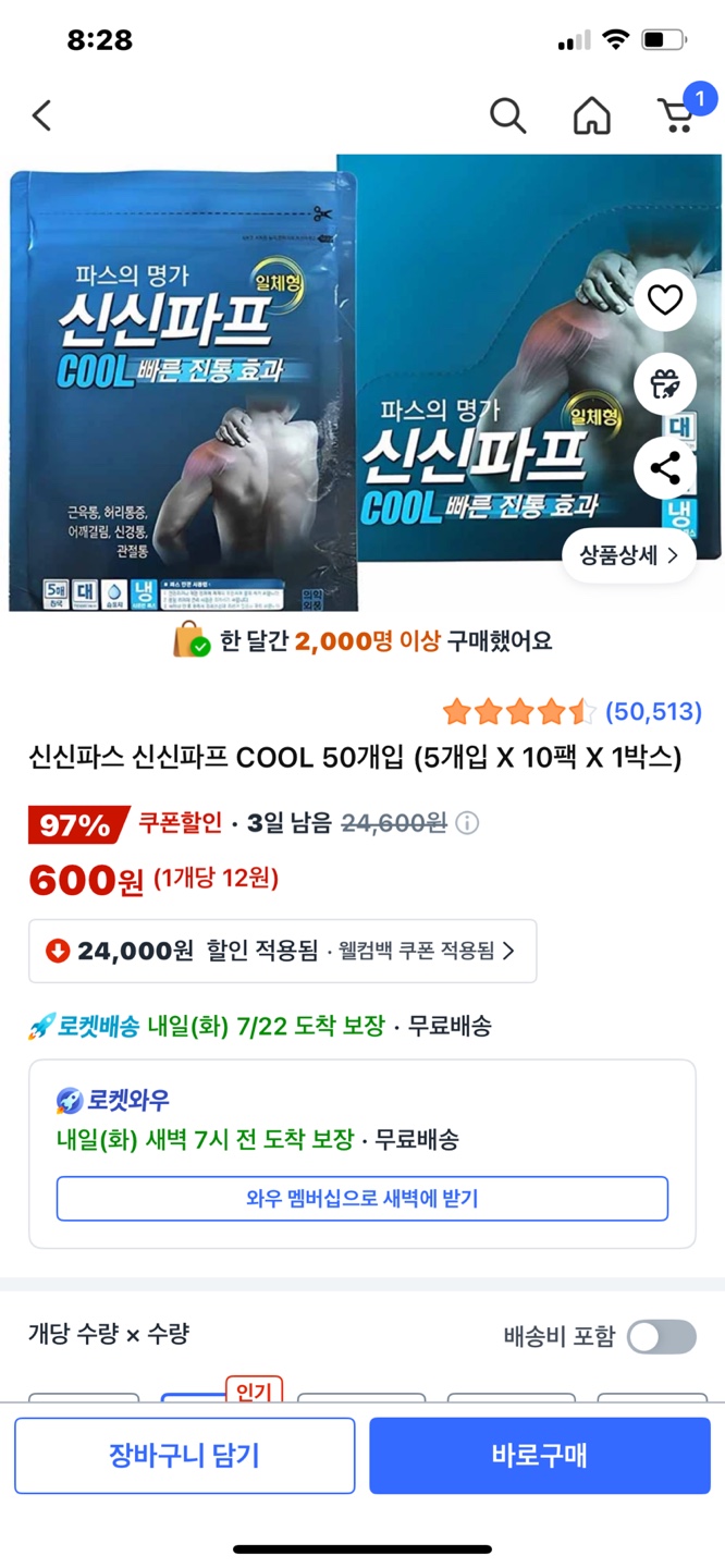 위 사진에서 보시다시피... 저는 24,000원짜리 웰컴백 쿠폰을 받고, 아래의 24,600원짜리 파스를 600원에 구입을 했습니다~