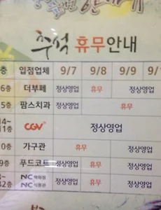 2014년 9월 추석날에 nc백화점 불광점과 내부에 입점한 푸드코너, 식품관, 가구관, 팜스치과, CGV, 더부페의 휴무정보입니다. nc백화점와 nc백화점 식품관(구 킴스클럽), 더 부페, 9층 푸드코너 등은 9월 8일 추석 당일에만 휴무를 한다고 하며, 9월 7일, 9일, 10일은 정상영업을 한다고 합니다. 더부페 프리미엄 불광점, 예스마레 NC백화점 불광점에 생긴 패밀리 뷔페 레스토랑 오픈 예스마레 NC백화점 불광점 패밀리 뷔페 레스토랑 폐업, 휴업 정보 NC백화점 모던하우스 크리스마스 트리존의 용품들의 가격정보 - 집에 성탄트리 만들기와 구입방법 킴스클럽(Kim's Club) 불광점, NC백화점 엔씨 식품관, 리빙관으로 이름 바꾸고 영업중(영업시간과 휴무일) NC백화점, 킴스클럽(Kim's Club..