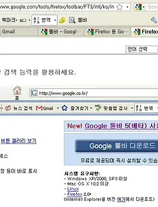 파이어폭스 3.5.1과 구글 툴바 5 베타 어제 firefox가 업데이트가 되었다고해서 업그레이드를 했다... 다른건 모르겠고, 간혹 다운되던 현상과 채감 속도가 좀 빨라진듯... 근데.. 허걱 구글 툴바의 작동을 안하고, 로그인도 안된다... 혹시나 하고 새로운 툴바가 나왔나하고 찾아보니... Google toolbar 5(베타) 가 나왔다는... http://www.google.com/tools/firefox/toolbar/FT5/intl/ko/ 다행히도 이것을 설치하니 로그인도 되고, 툴바도 정상적으로 작동... 혹시 불여우를 3.5 로 업그레이드 하고, 구글툴바가 안되는 분들은 한번 설치해 보시길~ http://www.google.com/tools/firefox/toolbar/FT5/intl/ko/ http://ietoy.tistory.c.. 2009. 7. 24.