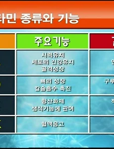 MBC 프라임 - 좋거나 나쁘거나, 비타민의 숨은 진실 지용성인 A,D,E, K A는 시력유지, 세포의 건강유지, 골격성장의 기능에 결핍되면 야맹증, 안구건조증, 피부이상을 유발 D는 뼈의 성장, 칼슘 흡수를 촉진하는 기능에 결필되면 구루병, 골연화증, 골다공증을 유발 E는 향산화제, 생식기능에 관여하며, 결핍되면 적혈구 용혈, 빈혈을 유발 K는 혈액응고의 기능을 담당하며, 결핍시 출혈을 유발 수용성인 B1(티아민), B2(티아민), B6(피리독신), B7(비오틴), B9(엽산),B12(코발라민) , C B1는 탈탄산반응의 기능, 결핍시 각기병 B2는 산화, 환원반응에서 수소를 전달하고, 결핍증은 구내염, 가각염, 설염, 구순염을 유발 B6는 체내 지방과 단백질 이용률 향상과 신경전달 문질 합성, 결핍시..