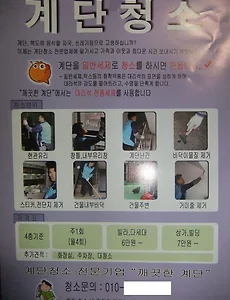 계단, 복도에 음식물 자국, 쓰레기등으로 고생하십니까? 이제는 계단청소 전문업체에 맡기시고 가족과 이웃과 정다운 시간 보내시기 바랍니다 라는 광고문구가 써있는 계단청소 용역... 빌라나 다세대 연립주택에 사는 사람이라면 이런 전단지가 집앞에 붙어 있는것을 자주 보고는 합니다. 계단을 일반세제나 락스 등의 화학약품으로 청소를 하면 대리석이 상하고, 강도가 떨어져서 수명을 단축한다는 친절한 메세지도있고, 현관유리, 창틀, 내부유리창, 계단난간, 바닥이물질, 스티커, 전단지 제거, 건물내부바닥, 건물주변, 거미줄 등도 제거를 해주고, 가격은 4층을 기준으로 주1회(월4회)에 연립주택은 6만원, 상가나 빌딩은 7만원이고, 화장실, 주차장, 대청소 등은 추가견적 비용이 발생한다고... 물론 상가나 빌딩같은 경우는..
